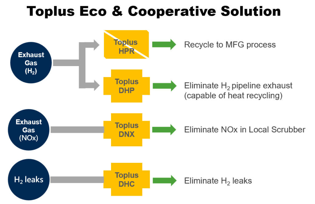 Toplus offers a comprehensive hydrogen and exhaust gas treatment solution. Our SEMI S2–certified Hydrogen Purification and Recycling (HPR) system safely recovers hydrogen from process exhaust for reuse or power generation, reducing operating costs, energy consumption, and carbon footprint.